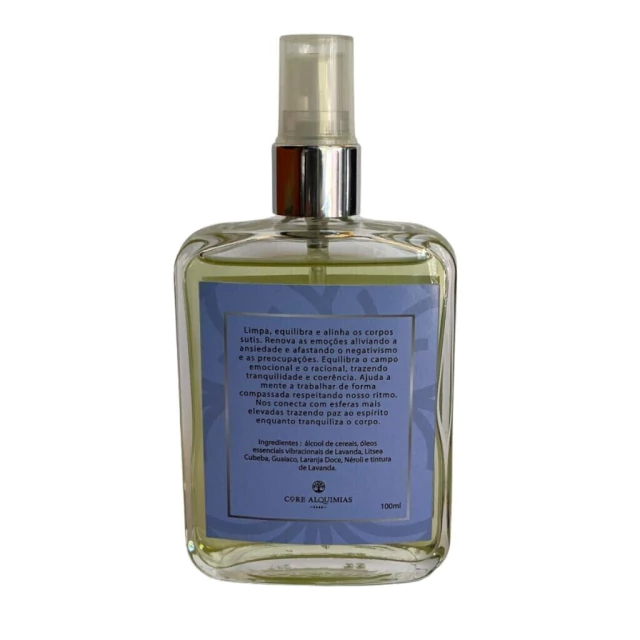 Ingredientes: álcool de cereais, óleos essenciais vibracionais de Lavanda, Litsea Cubeba, Guaiaco, Laranja Doce, Néroli e tintura de Lavanda.