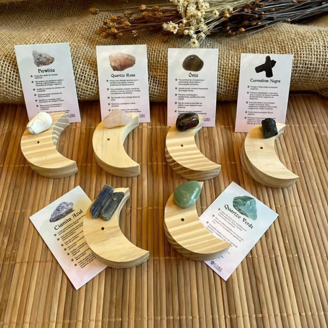 Incensário de Madeira em formato de Lua Crescente com cristal intuitivo, ou seja, enviado aleatoriamente.