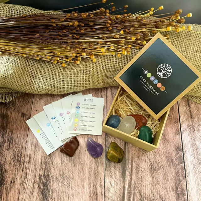 Kit de cristais para equilíbrio dos 7 chakras + cartas explicativas + caixa de MDF