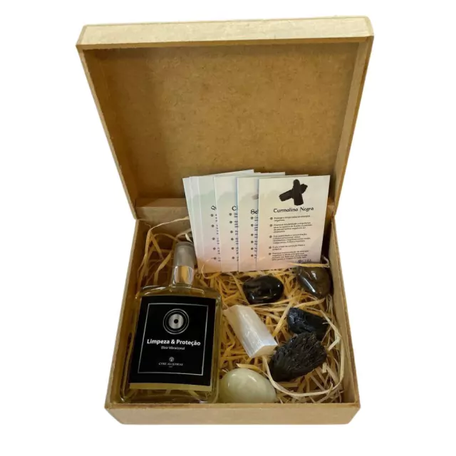 O kit vem em uma caixa de MDF de 16 x 16 x 7 cm, excelente opção para guardar seu ritual e para presentear.