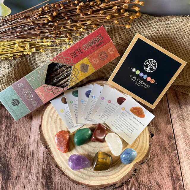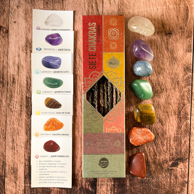Kit para equilíbrios dos chakras composto por 7 cristais, cartas explicativas, caixa de MDF e incenso com 7 aromas, um para cada chakra.