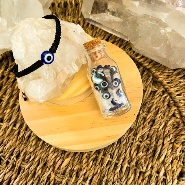 Composto por sal grosso, 7 cravos e o símbolo do olho grego, este amuleto une elementos poderosos e usados em diversas culturas como itens de proteção.