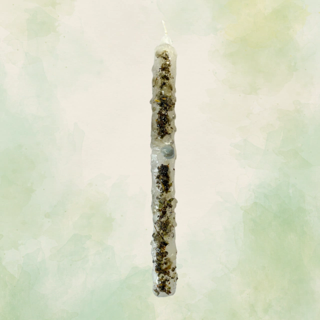 Esta vela feita de maneira artesanal incrustrada com cristais e ervas é perfeita para seus rituais.